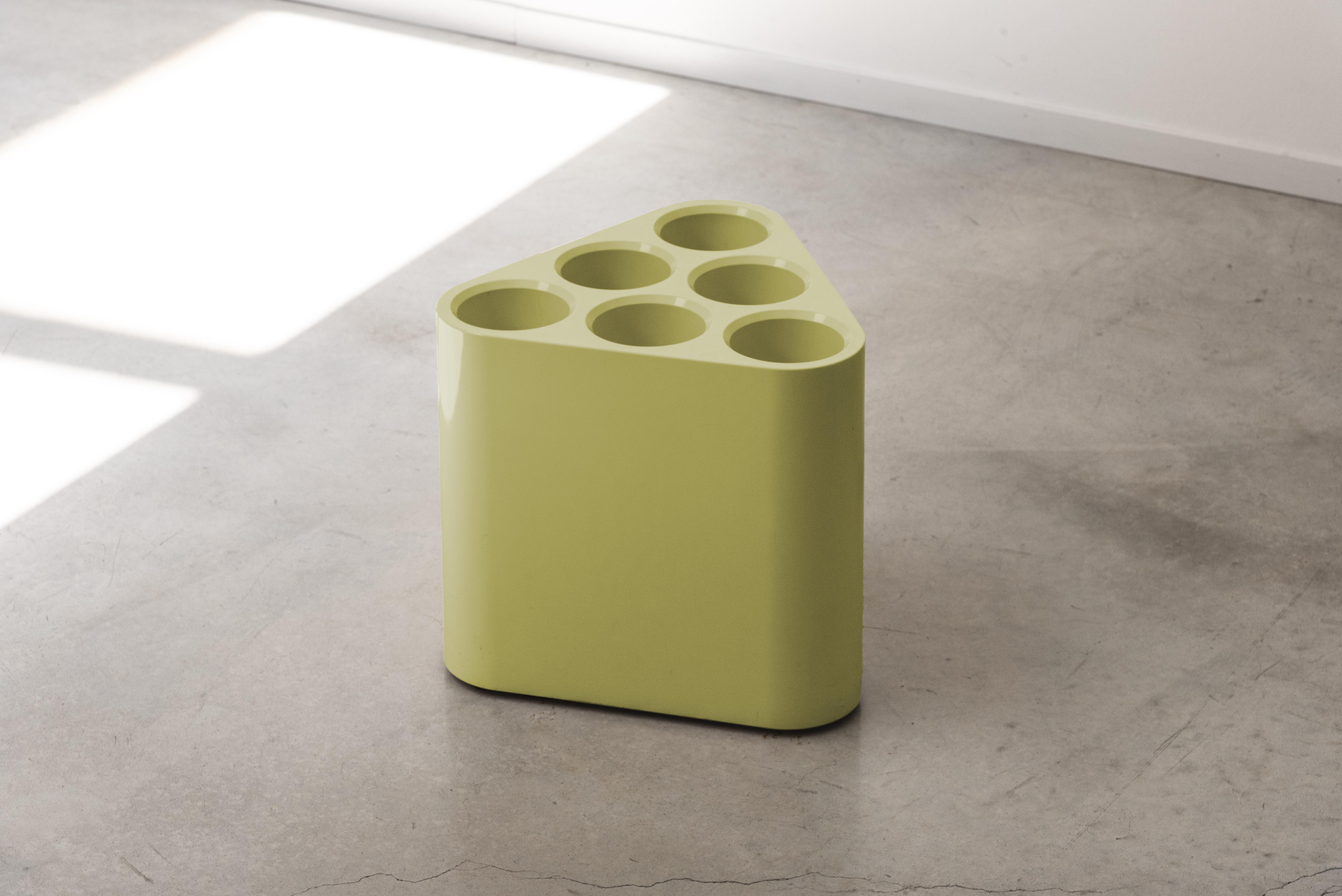 The triangular shape was chosen because it fits well in any position in a room, including corners, and tessellates beautifully. A simple series of holes enables furled or unfurled umbrellas of any size to be popped easily. Poppins feels both serious and playful; the glossy plastic emphasizes its waterproof qualities, while the form reminds us of a game – like the triangle used in billiards or snooker. By happy coincidence it is also the perfect shape for wine bottles!”