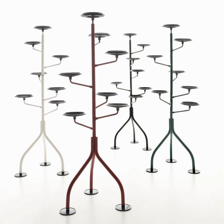 It was 1983 when Achille Castiglioni imagined a subtle presence, dynamic in its composition, flexible in its overall articulated design, whose scope was to host houseplants in their own pots, held up by round small plates (as if they were caring hands) displayed regularly along all the height of the structure. Horizontally, each item can be turned around by 120 degrees, so to better arrange plants of different sizes to better benefit from the daylight, on this little indoor ‘vertical wood’.