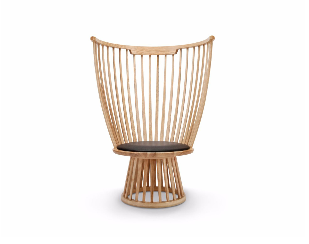 Originally a dramatic and sculptural take on a British design classic, Fan is available as a high back chair, dining chair, stool and table. The stools and chairs have a black leather seat pad, while the chairs feature a curved back, offering support and comfort. Available in Black Birch or Natural Oak.