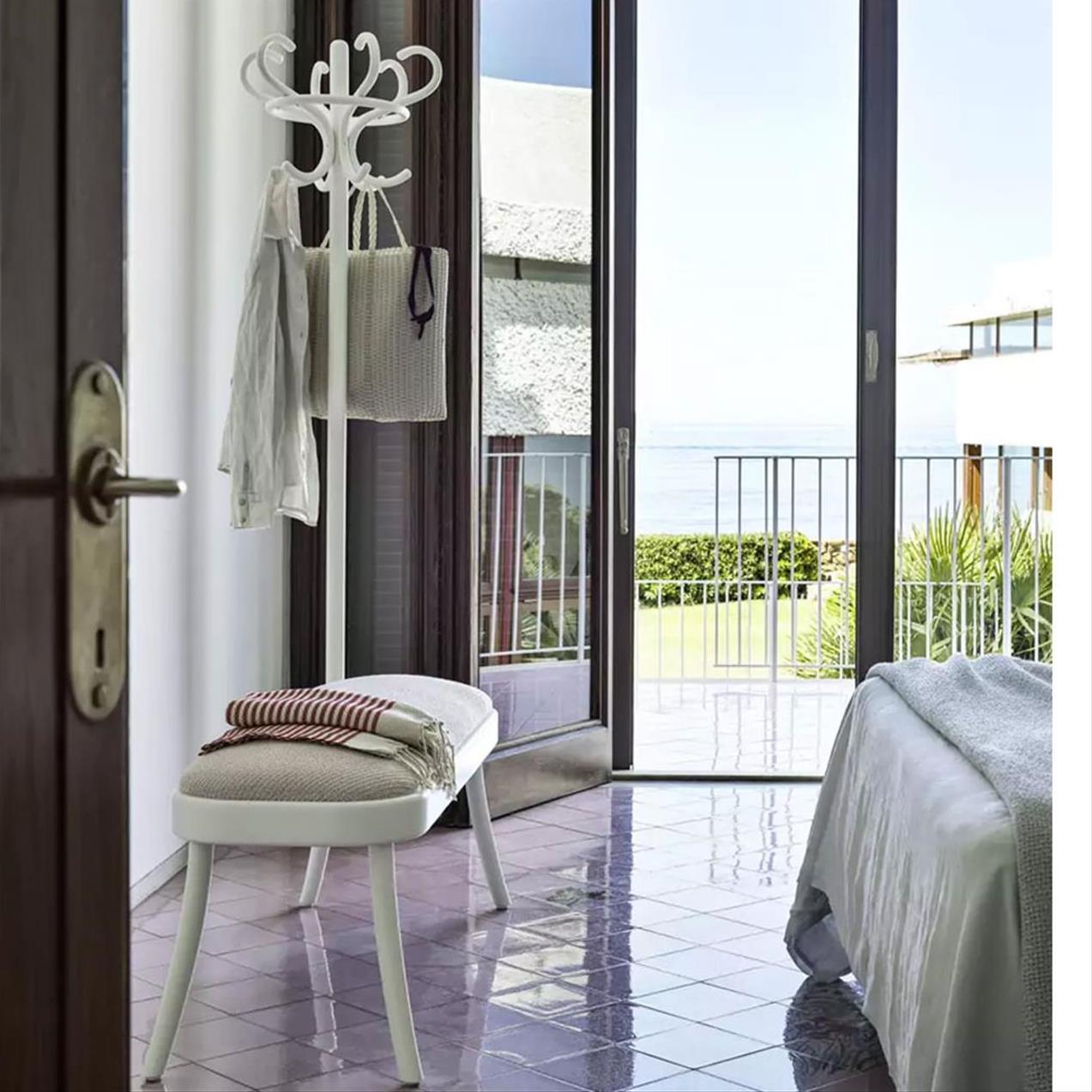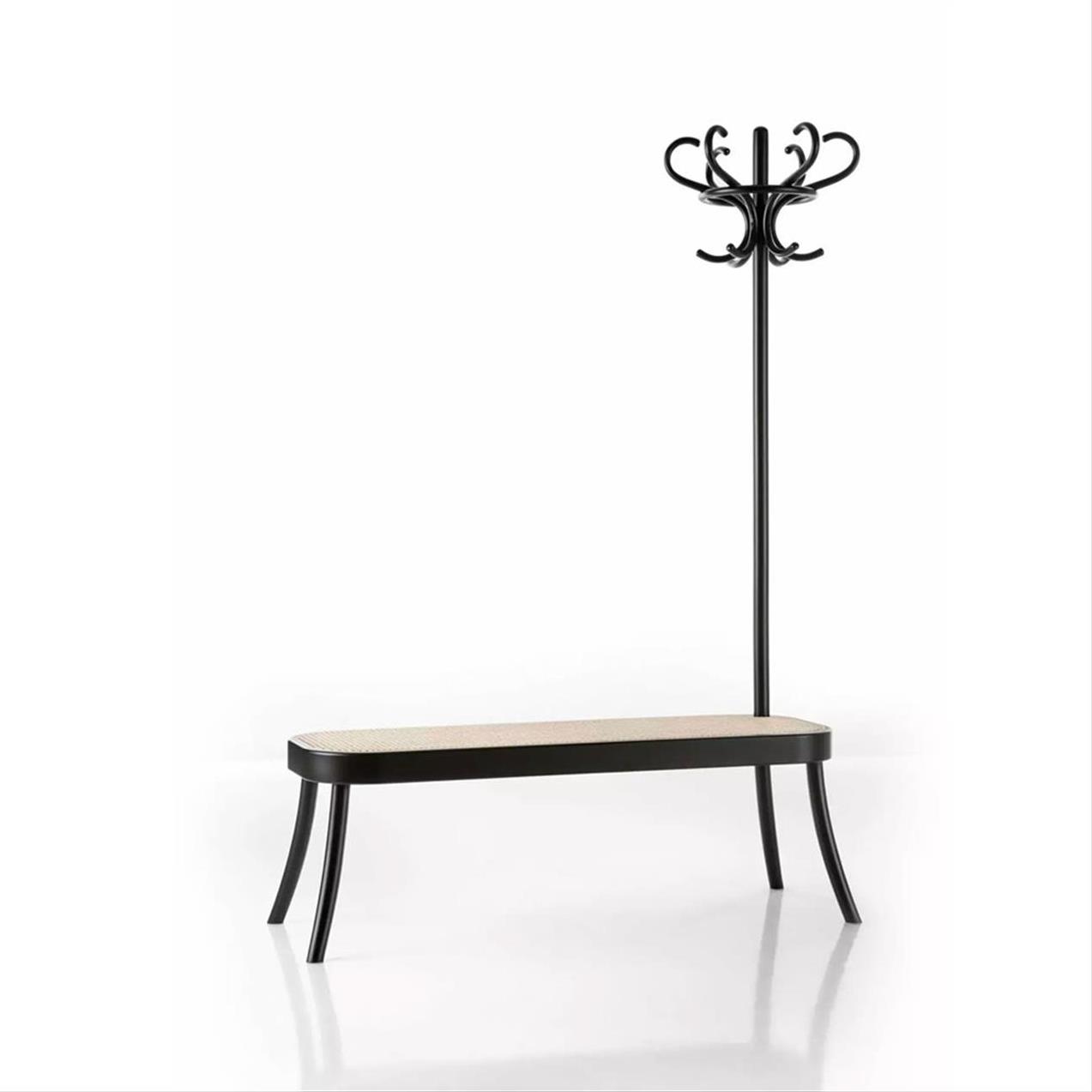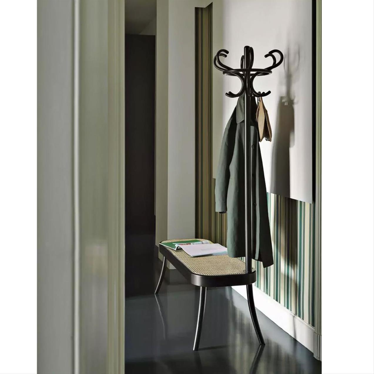 A coat rack bench that plays with the company’s stylistic features: bent wood and the Vienna cane seat. This item furnishes the hall but can at the same time fit easily into different areas of the house. Also available with upholstered seat.