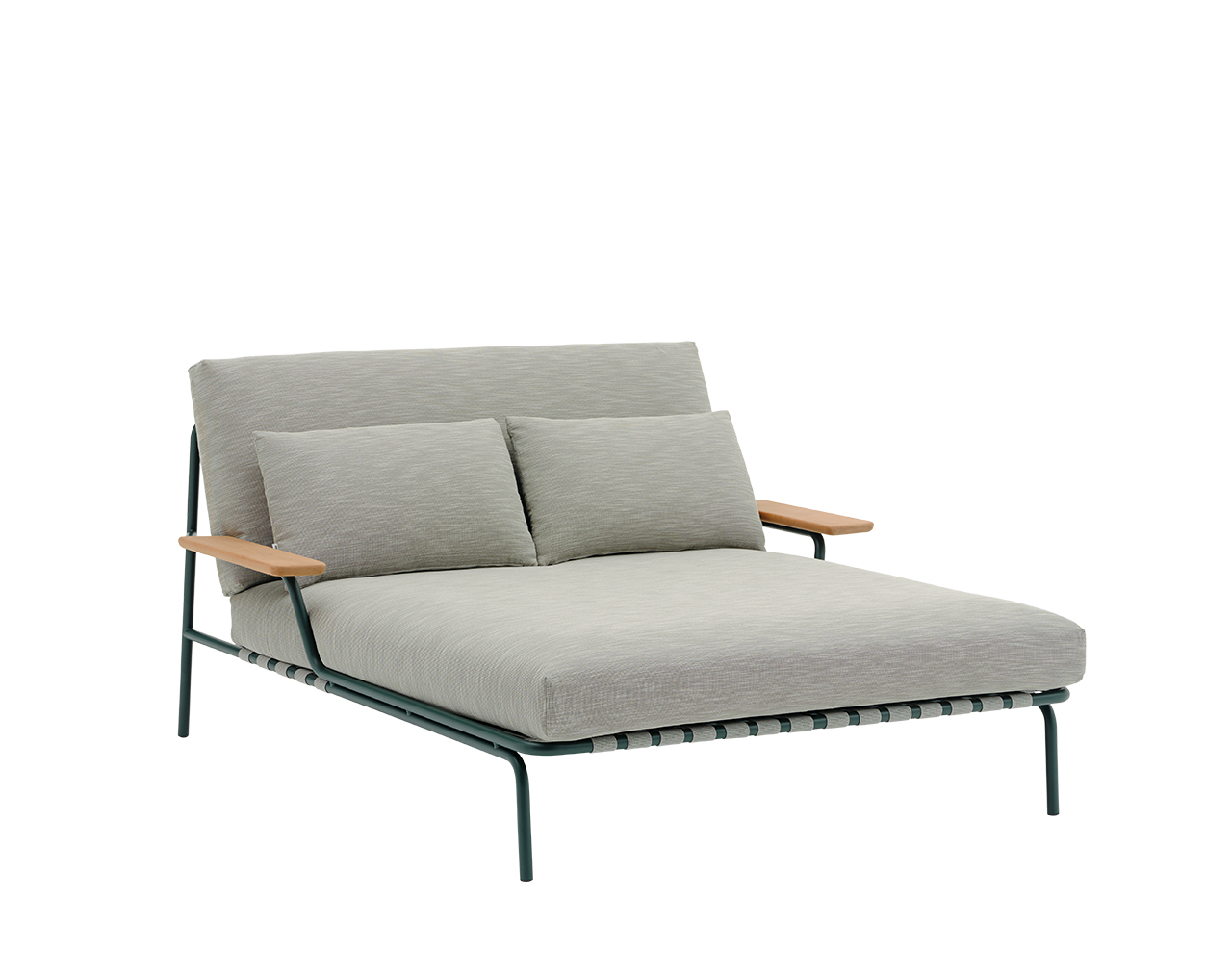 The Settle Lounge Bed w. Armrest invites you to settle into its comfort. With its deep, leaned backrest and extra cushion for added comfort, it’s ideal for long, leisurely hours spent unwinding outdoors. Its airy steel frame, complete with visible belts and intricate details, enhances its visual allure from all angles, while its armrests, made from FSC™-certified (FSC-C028824) sapele mahogany wood, add a warm, tactile feel. Settle’s steel frame is galvanized, primed, and powder-coated, ensuring corrosion resistance for long-lasting use. The plush cushions, made with quick-dry foam and durable outdoor textiles, offer fast-drying resilience in rain showers and year-round durability when used with an outdoor cover.