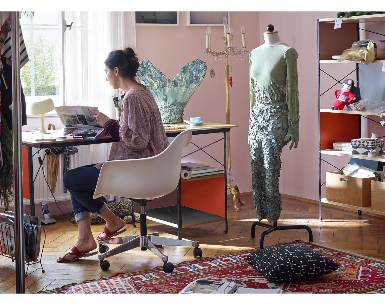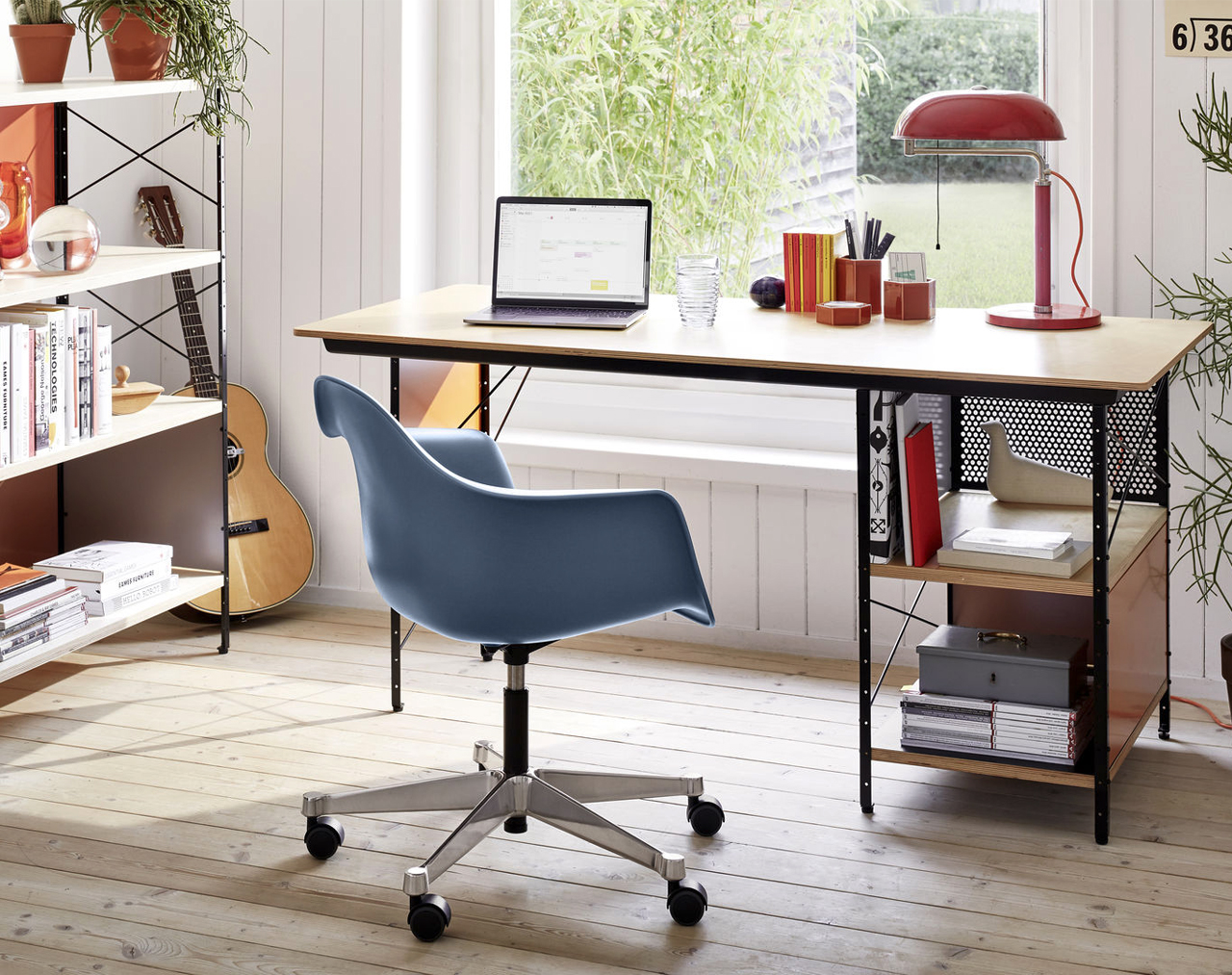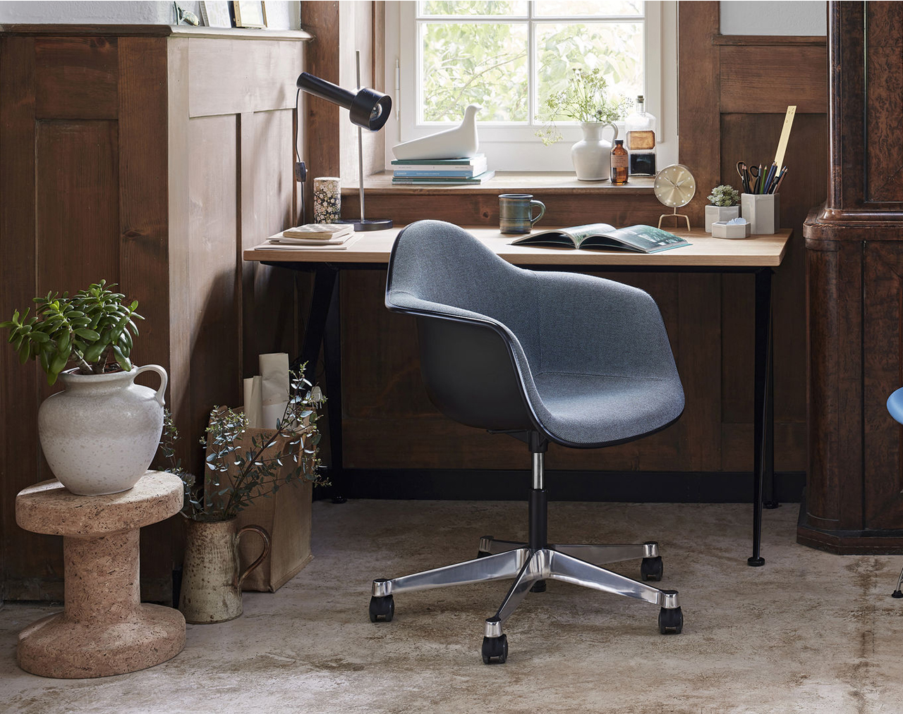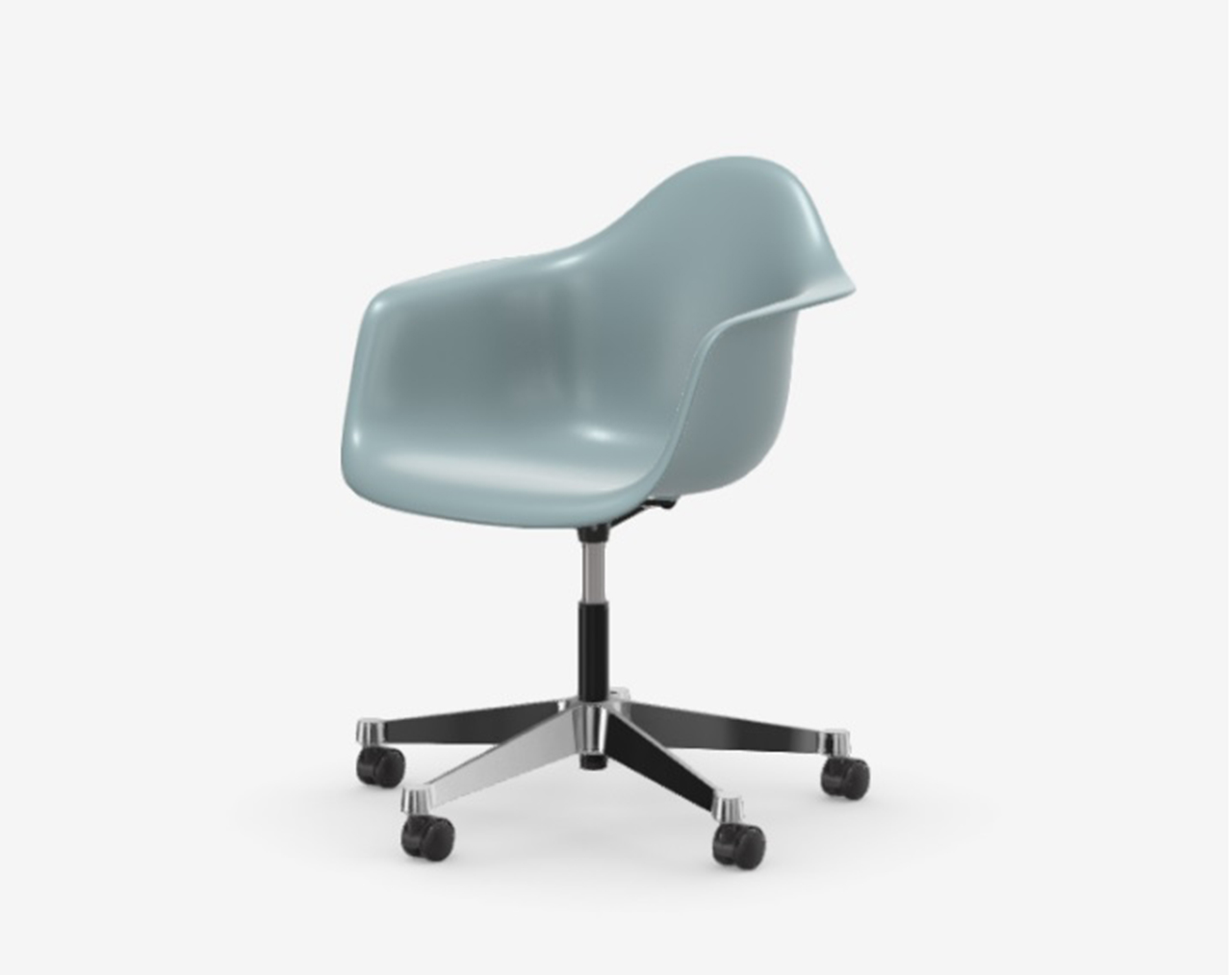 Thanks to the large selection of bases, the Plastic Chairs RE by Charles and Ray Eames can be utilised in a wide range of different settings. For example, the PACC (Pivot Armchair Cast Base on Castors), with its height-adjustable swivel-mount base, is ideal for use in informal office spaces and studio offices. The various colour options of the seat shells in post-consumer recycled plastic and a choice of upholstery variants make it easy to find the right chairs for all types of environments.