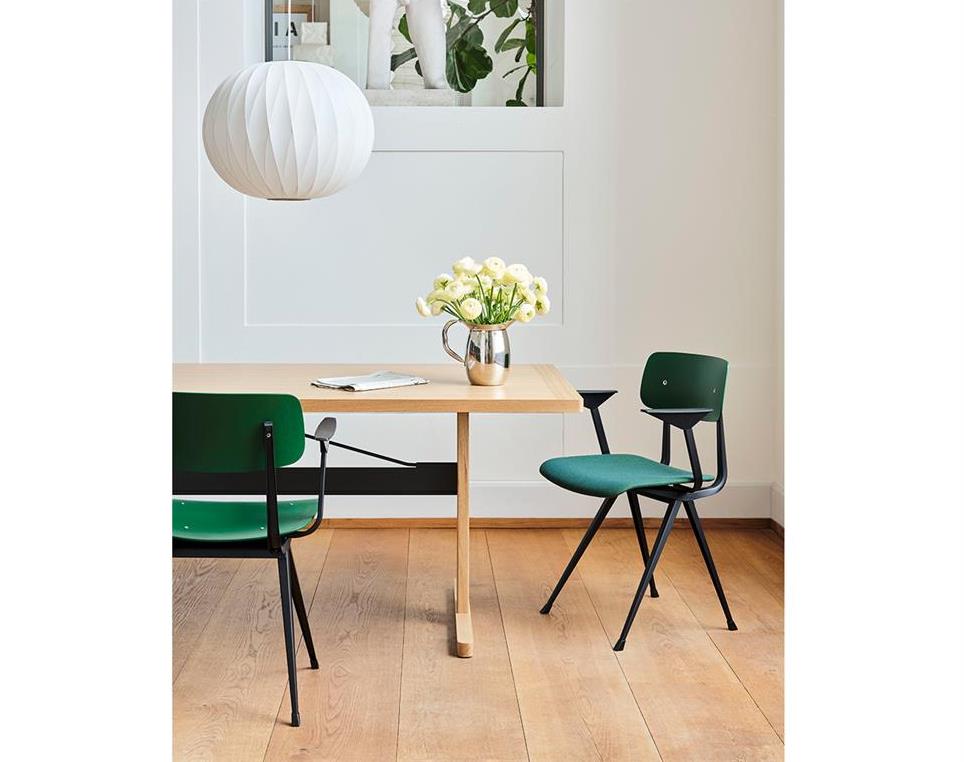 The Result Armchair shares the same thin steel-sheet base, oak seat and backrest as the original Result Chair, but is supplemented by elevated armests that bring additional comfort and functionality to the design. Originally created by Friso Kramer and Wim Rietveld while working at Ahrend in the 1950s, the cutout steel collection has been relaunched by HAY together with Ahrend. It is available in a variety of wood finishes and base colours, as well as a variant with upholstered seat and a fully upholstered version offered in a wide range of textiles and leather options. All variants can be coordinated with the Pyramid Table, making it a versatile seating set-up for use in many public and private contexts.