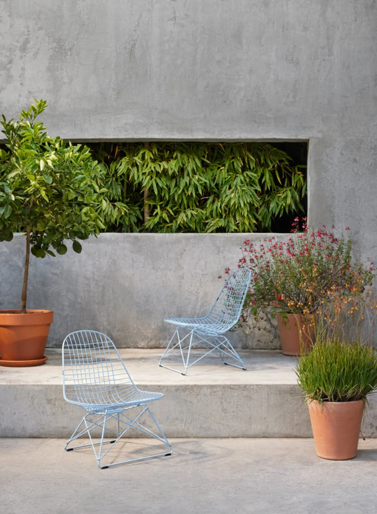 Charles and Ray Eames used several variants of the small LKR chair – including the LSR version with a plastic shell – in the Eames House, their legendary home in Pacific Palisades. Like all other Wire Chairs, the LKR is available without upholstery, with a seat cushion or with a two-piece seat and back cushion known as the ‘Bikini’ pad due to its shape. In the model without upholstery, it is also suited for outdoor use.
