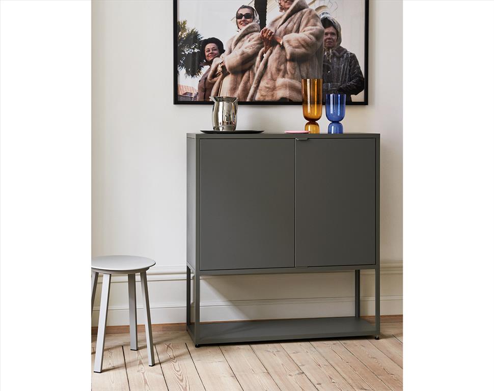 New Order Combination 201 comprises a large, closed storage space with two adjustable shelves and an open shelf space. This combination of elements provides an efficient and flexible space management solution where objects can be securely stored away or openly displayed. The aluminium grid is available in different colour options, with the possibility of adding panels, doors, trays and drawers to customize the appearance and functionality, creating infinite combinations and applications.