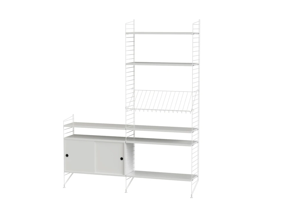 This combination opens up for creativity. Store everything you need on the shelves and in the cabinet and personalize the whole combination by hanging a painting next to the higher floor panels. Or just let the painting rest on the shelves.