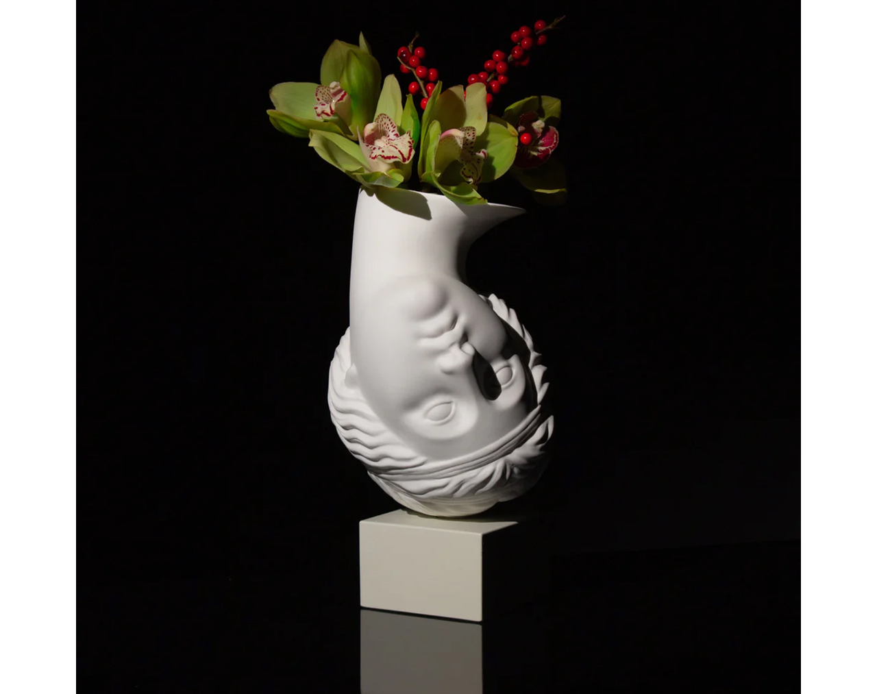 Amor Volat is a vase that seems to defy gravity, an upside-down head that transforms a classical sculpture into a symbol of lightness. Inspired by that moment when falling in love makes us feel as if weʼre floating in the air, at the mercy of a softer, brighter, more magical world. Amor Volat is not just a vase, itʼs a tribute to those who live with their hearts in flight. And the flowers? They are the secret language of emotions!