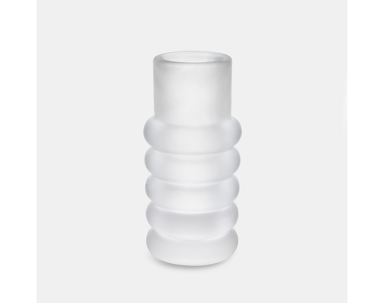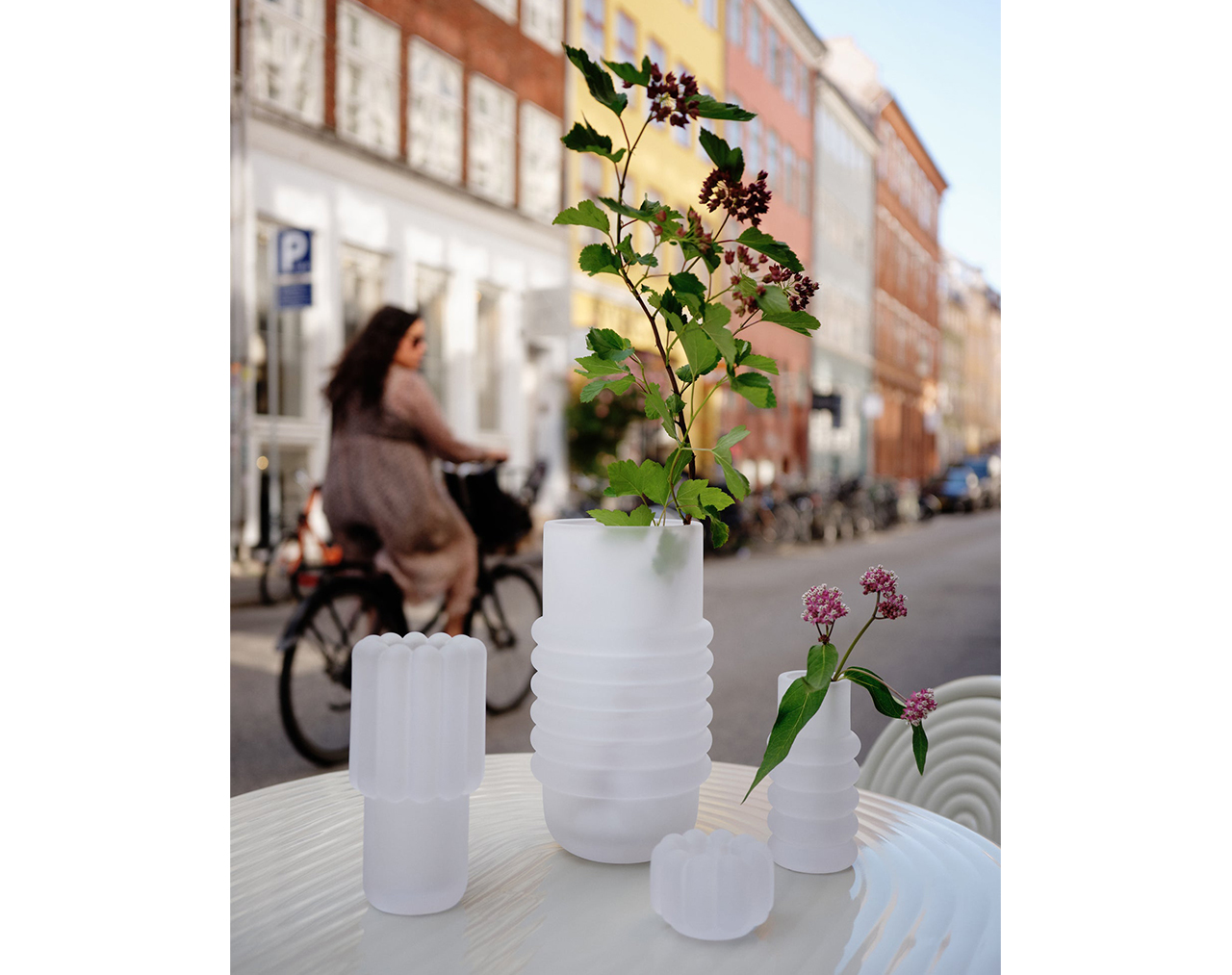 Press vases are designed to catch and refract light, casting eye-catching shadows. The heavyweight grooved vase is made of chunky coils of pure glass. Bold in silhouette and simple in function, it is manufactured by dropping big globs of molten glass and pressed in iron moulds.