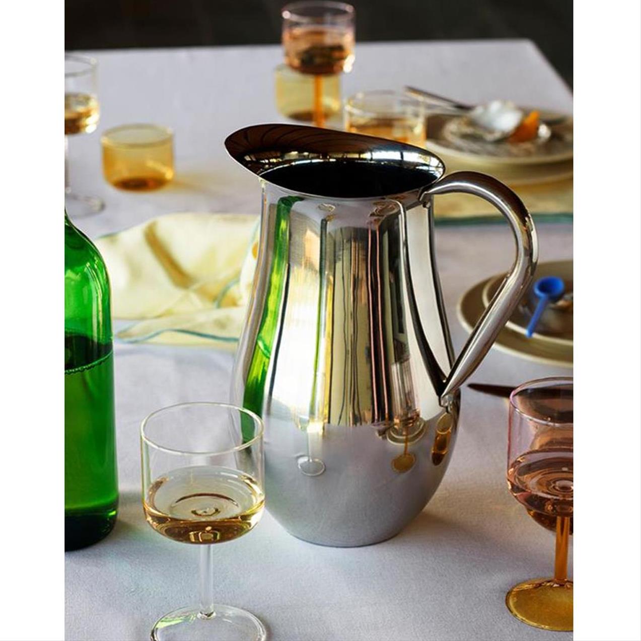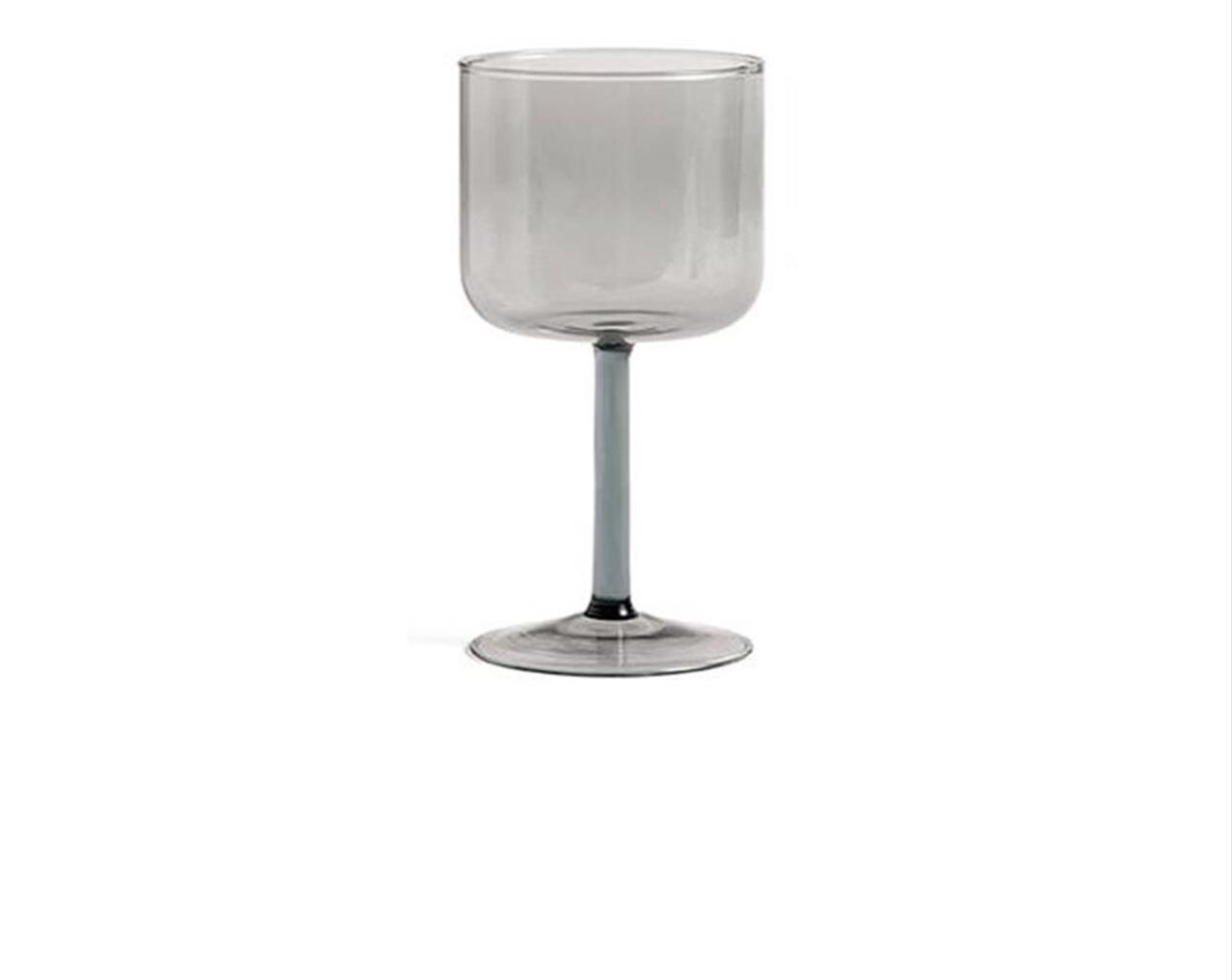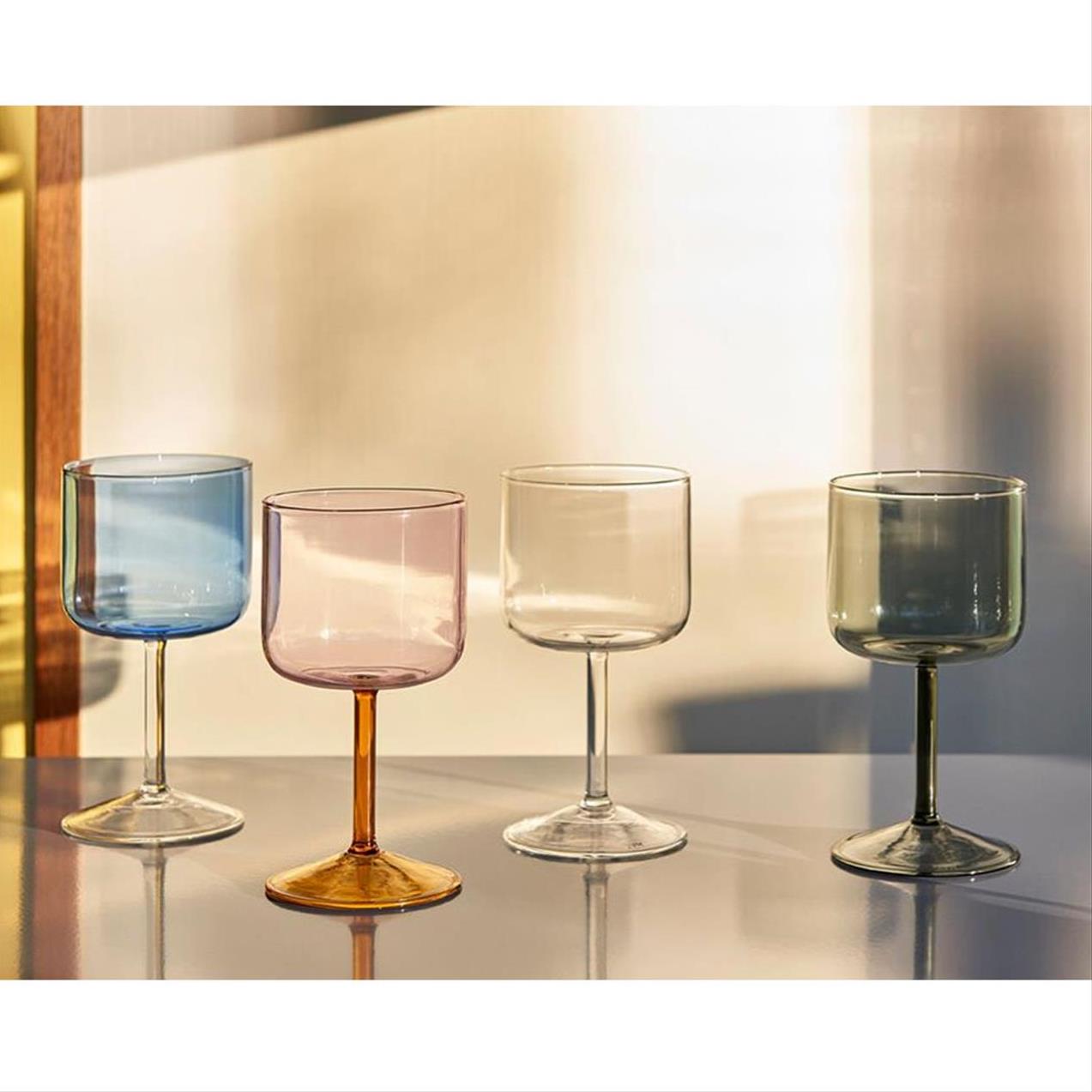 Tint Wine Glass is a collection of wine glasses made in tinted and clear borosilicate glass. The elegant, simple design is suitable for serving wine, as well as water, juice and other soft drinks. The glasses come in sets of two, available in different colours.