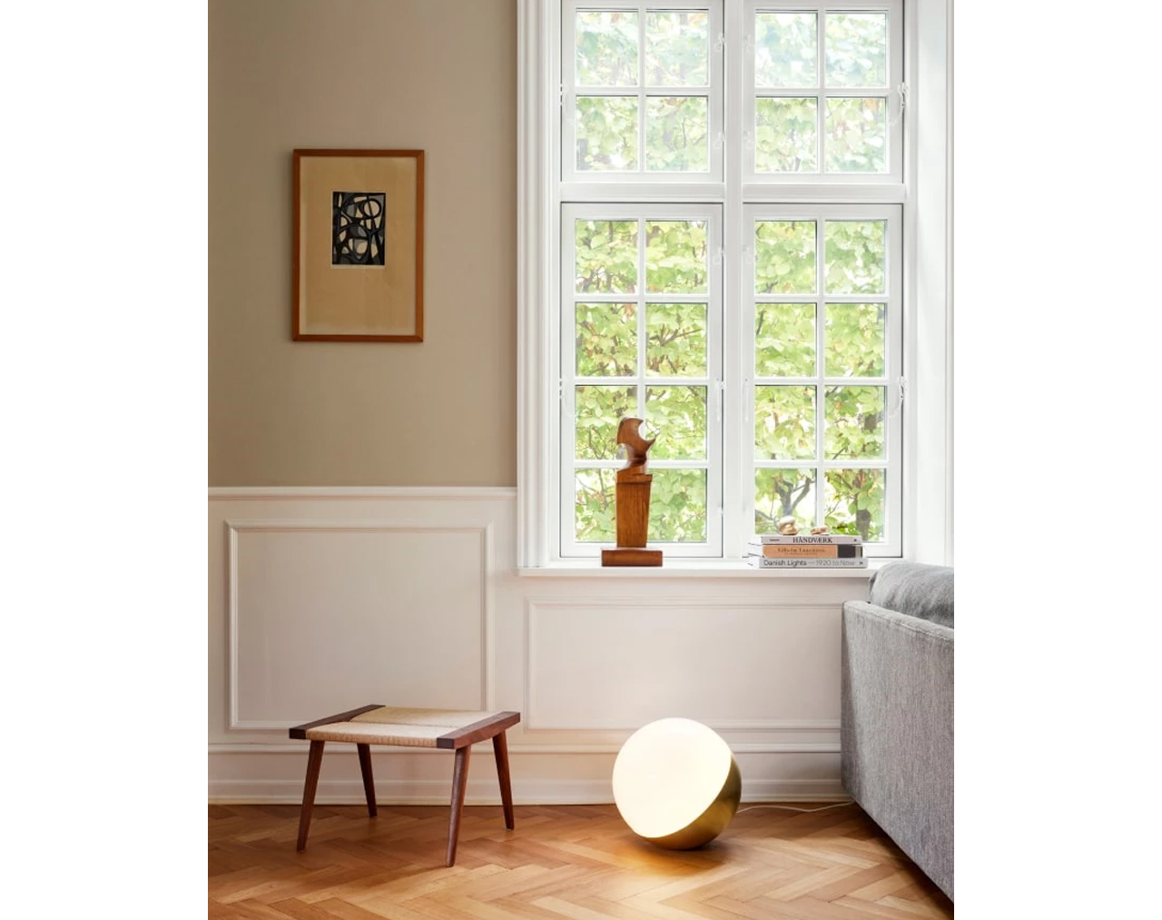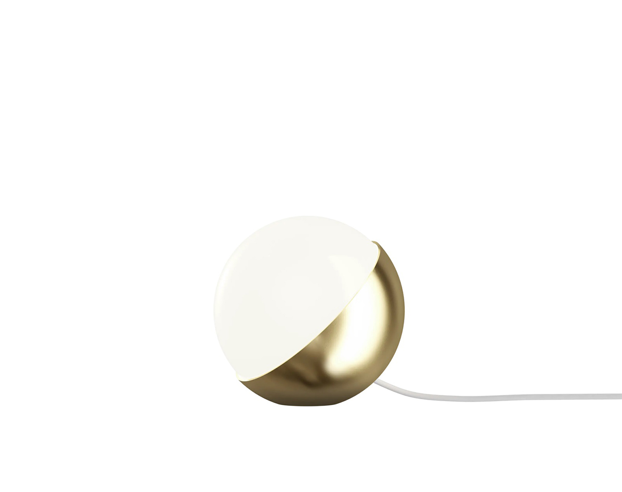 Surface: Brushed brass with fine hairlines. White opal glass, glossy. Materials: Housing: Brushed brass. Glass: Mouth-blown, 3-layered opal glass, glossy. Please note that the brass surface is left untreated. This means that the surface will change over time and develop a patina. Cord length: 2.5 m. Cord type: White plastic with plug. Switch: On/off switch on cord. Glass can be unscrewed to change the light source. Can be positioned on the ground as floor lamp or as table lamp as required.