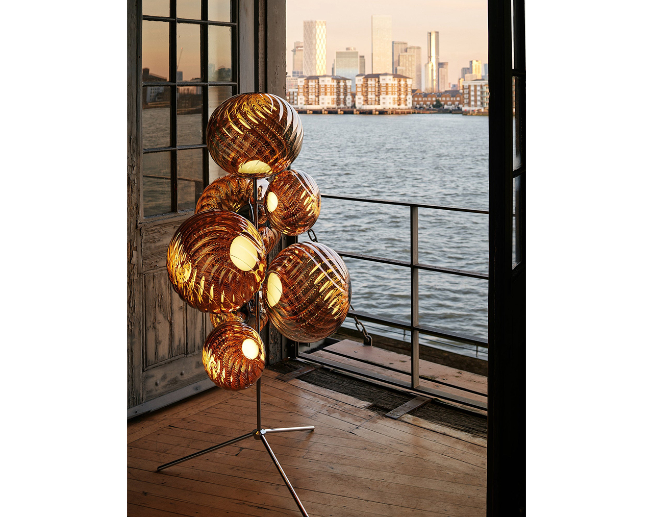Consisting of three medium WHIRL shades and four large WHIRL shades, the WHIRL Floor Chandelier in gold is an eye-catching floor light. Inspired by the op-art movement, it was designed to create mesmerising mirrored reflections through its spiral form. Crafted from lightweight yet durable polycarbonate, each shade is produced using advanced injection blow moulding and vacuum metallisation. Available in gold or silver finishes, it is compatible with Edison Screw (ES) or LED pendant fittings, making it versatile across different settings.