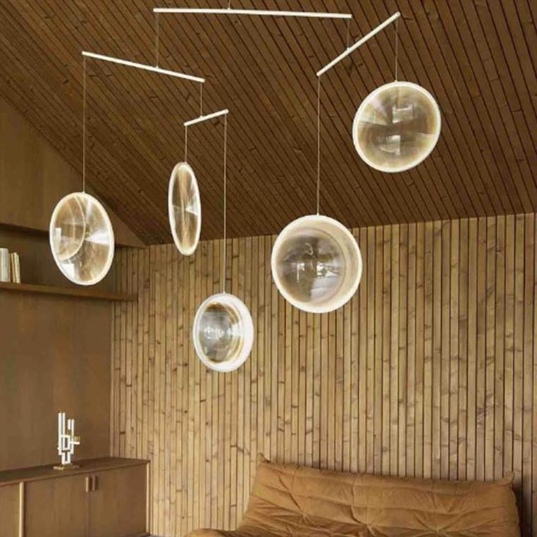 Chandelier composed of 3 luminous discs in PMMA (acrylic glass).But what if the planets were nothing more than soap bubbles that have remained intact as they travel through time? Armed with his astronomer’s telescope that let him observe their every movement, Yuji has transformed them into objects floating in a weightless world.