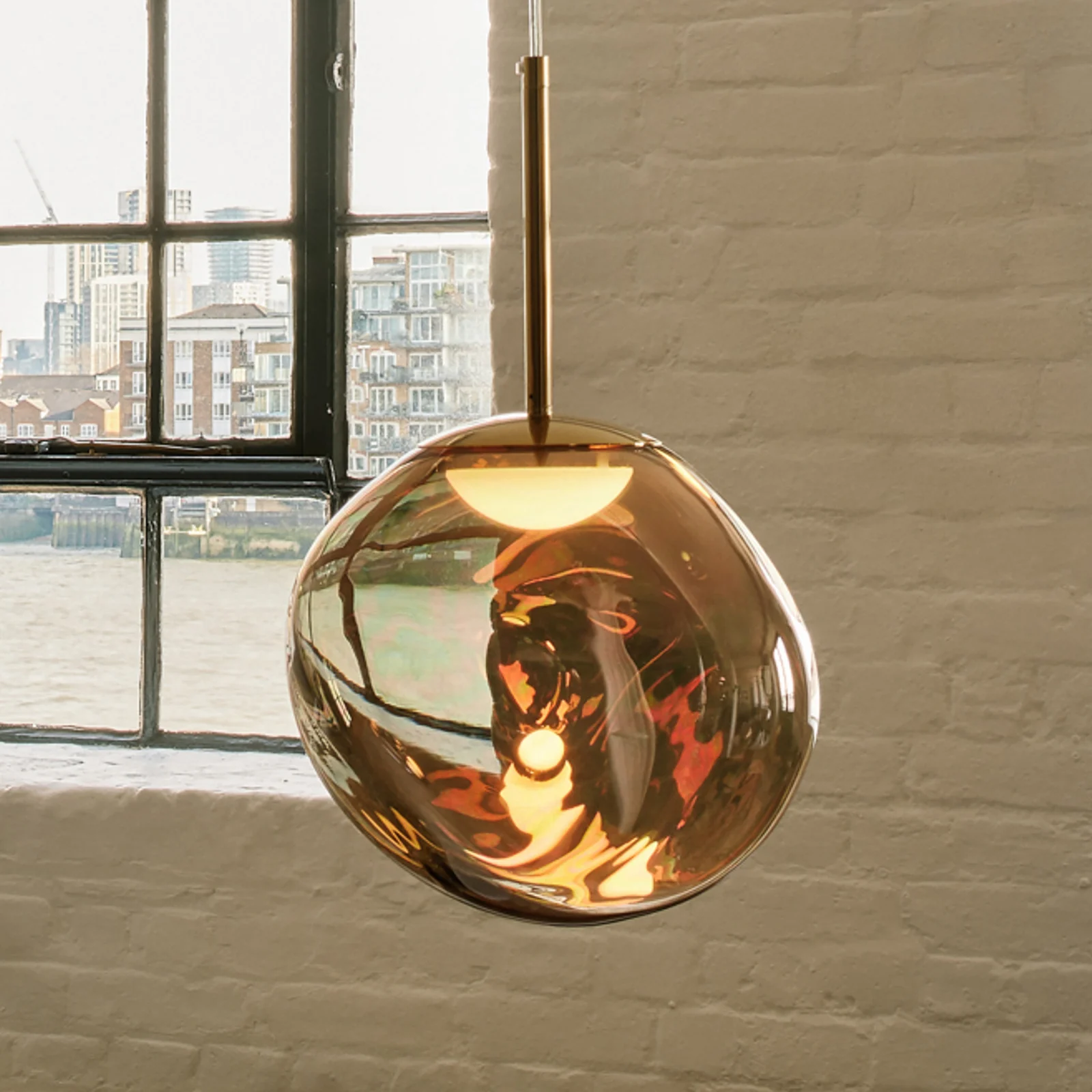 Melt is a beautifully distorted light that creates a mesmerizing melting hot blown glass effect. Its surface is reminiscent of the interior of a melting glacier or images of deep space. Now available with a custom-made Tom Dixon LED ring integrated into the fitting.Also available in copper and chrome.