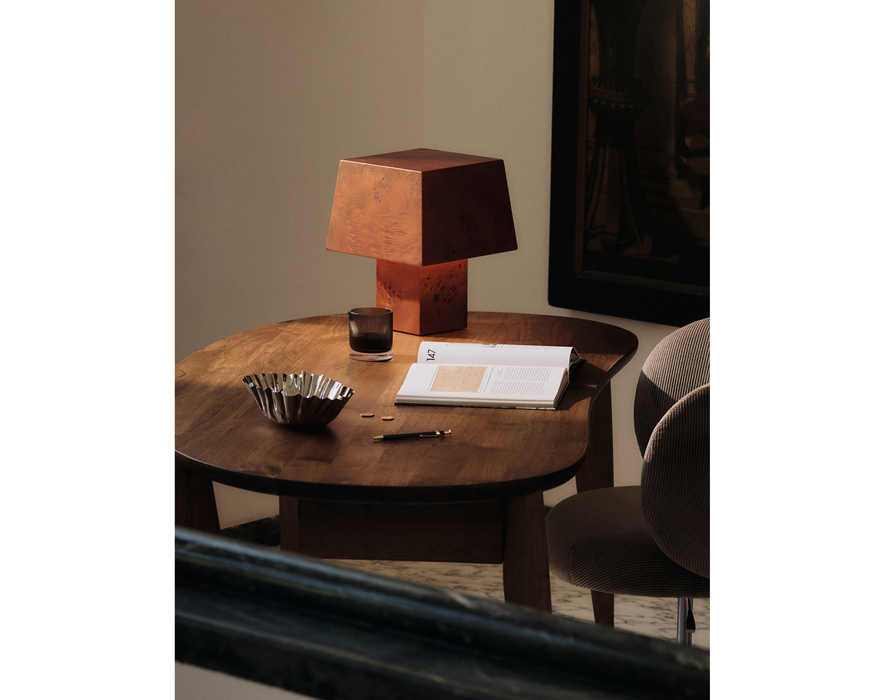The Burl Table Lamp combines a clean, square silhouette with the warmth and richness of FSC™ Mix-certified burl veneer. The swirling wood grain brings depth and natural texture, while the soft light the lamp casts creates a calm, ambient atmosphere. Sculptural yet understated, it’s an ideal choice for living rooms, bedrooms or quiet corners in need of gentle illumination.