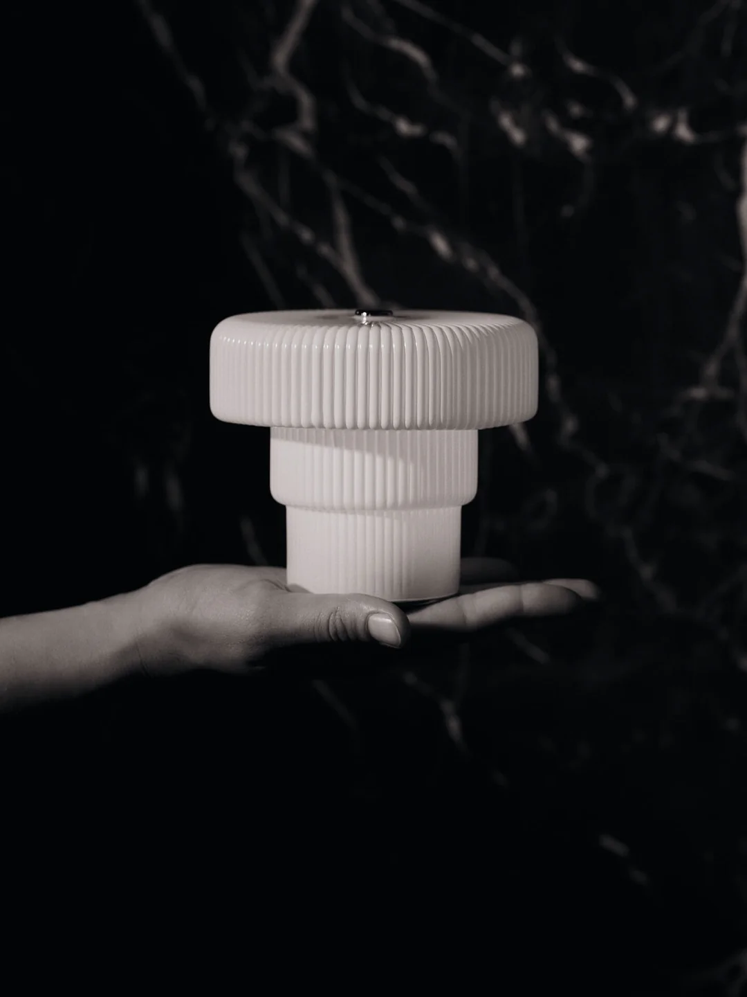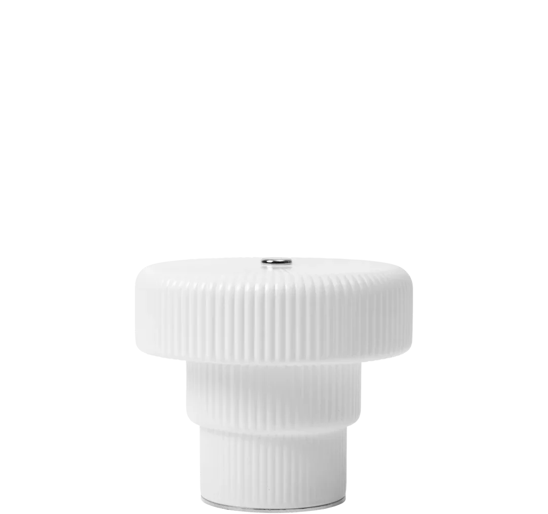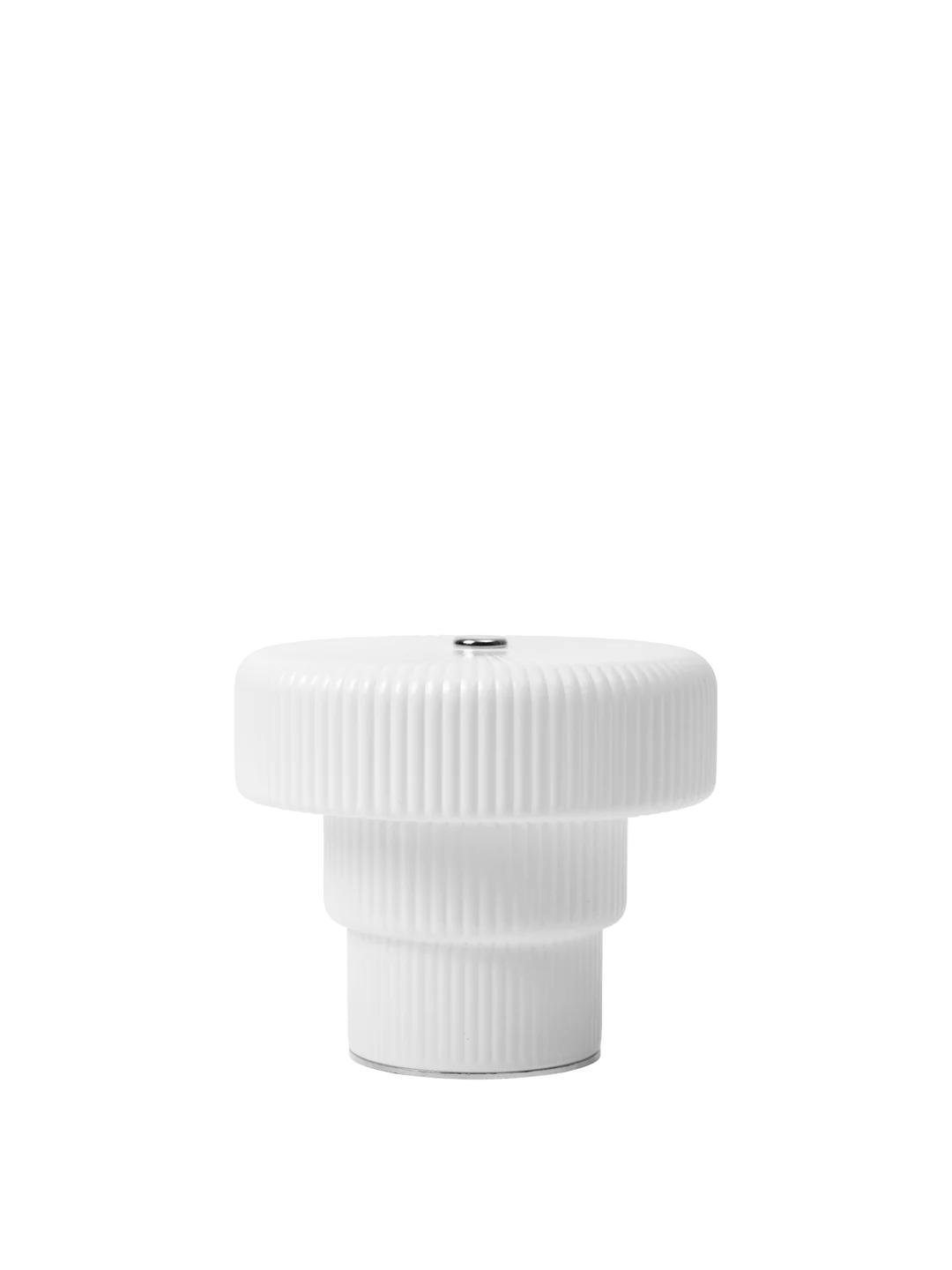 Add a soft glow to your space with the Ripple Portable Lamp. Crafted from mouth-blown glass with a rippled surface and white opal finish, it casts a warm, diffused light. With three brightness levels, the compact design is perfect for intimate evenings or adding ambience to a table setting.