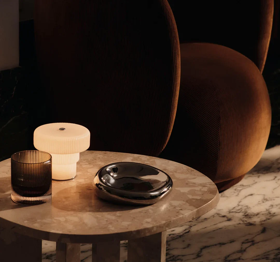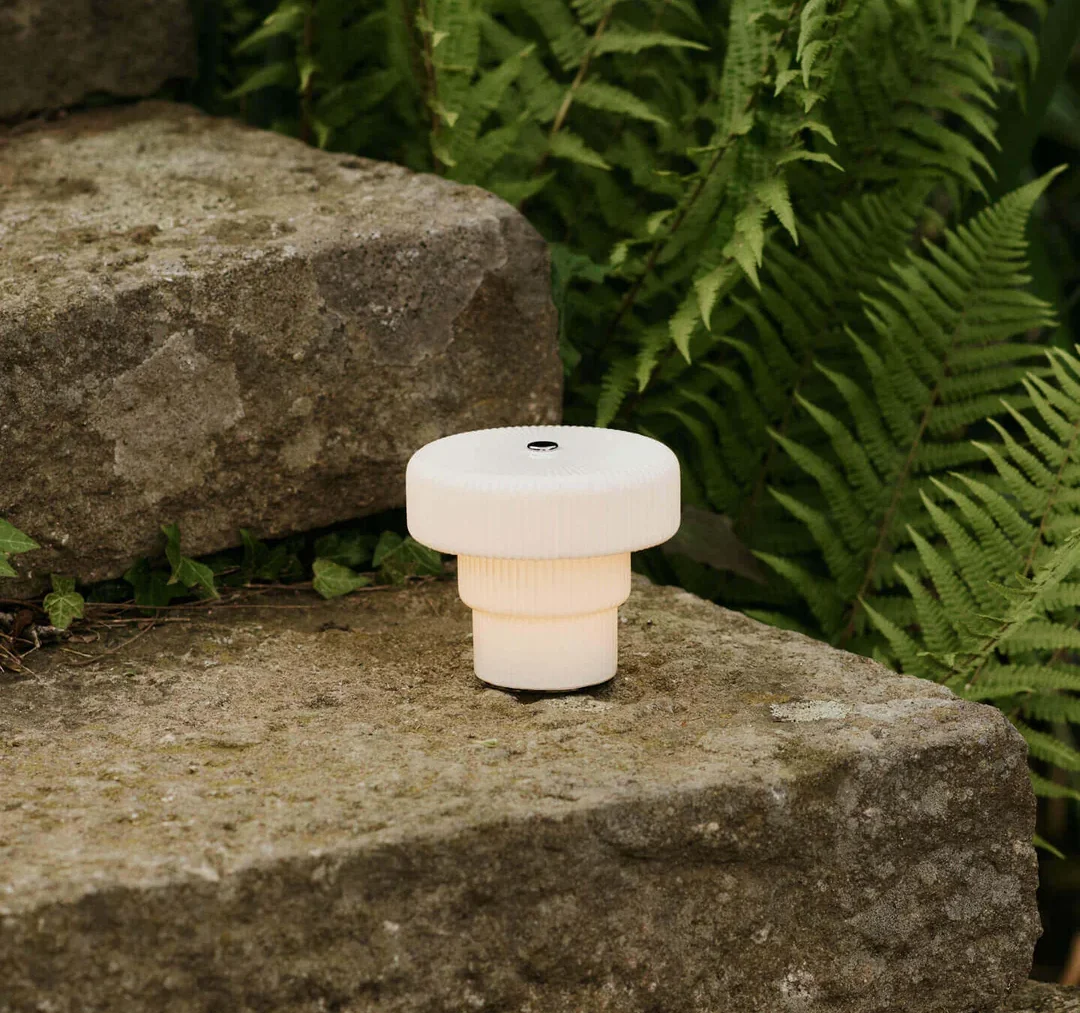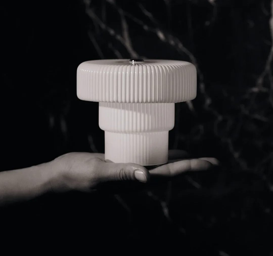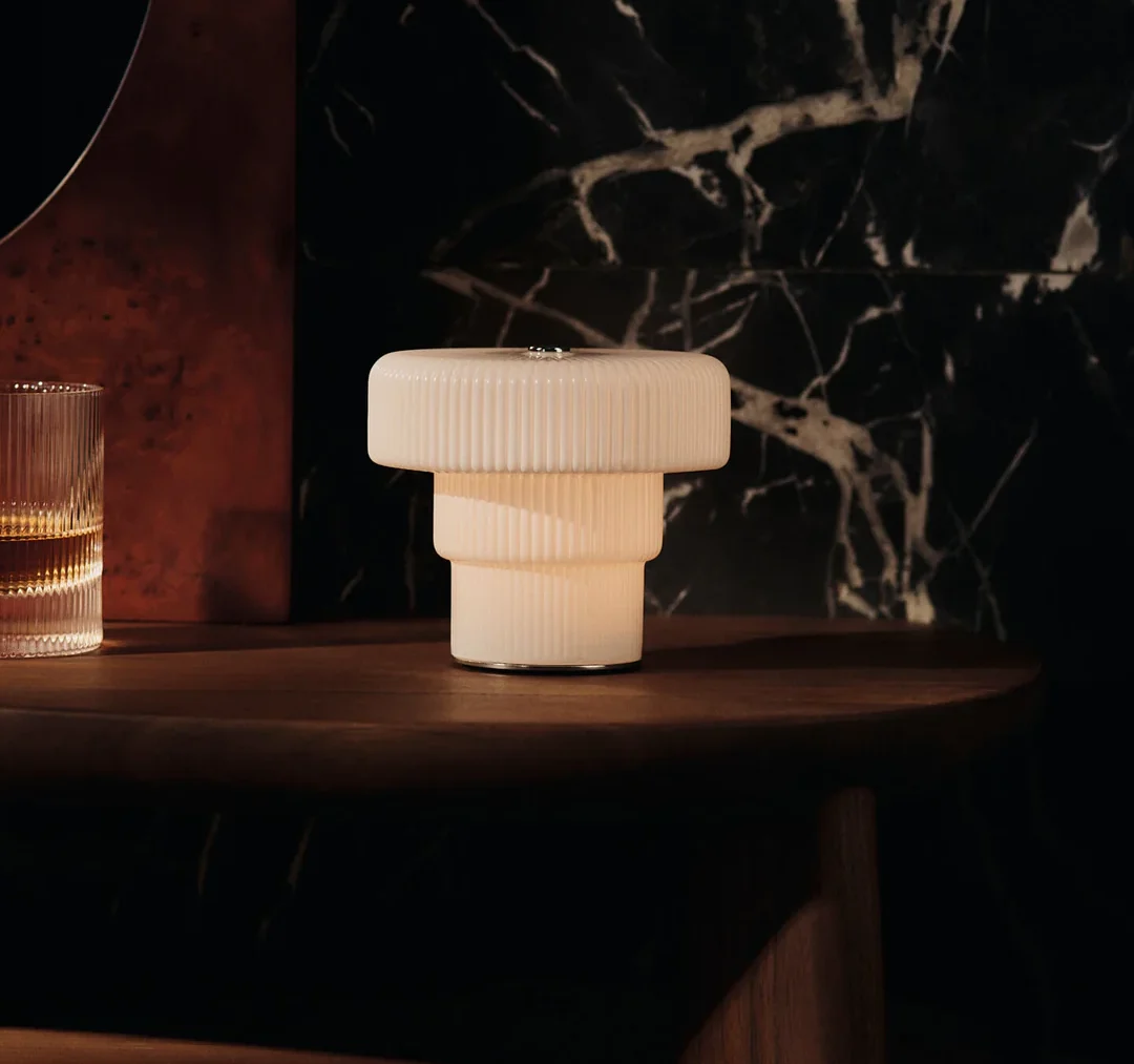 Add a soft glow to your space with the Ripple Portable Lamp. Crafted from mouth-blown glass with a rippled surface and white opal finish, it casts a warm, diffused light. With three brightness levels, the compact design is perfect for intimate evenings or adding ambience to a table setting.